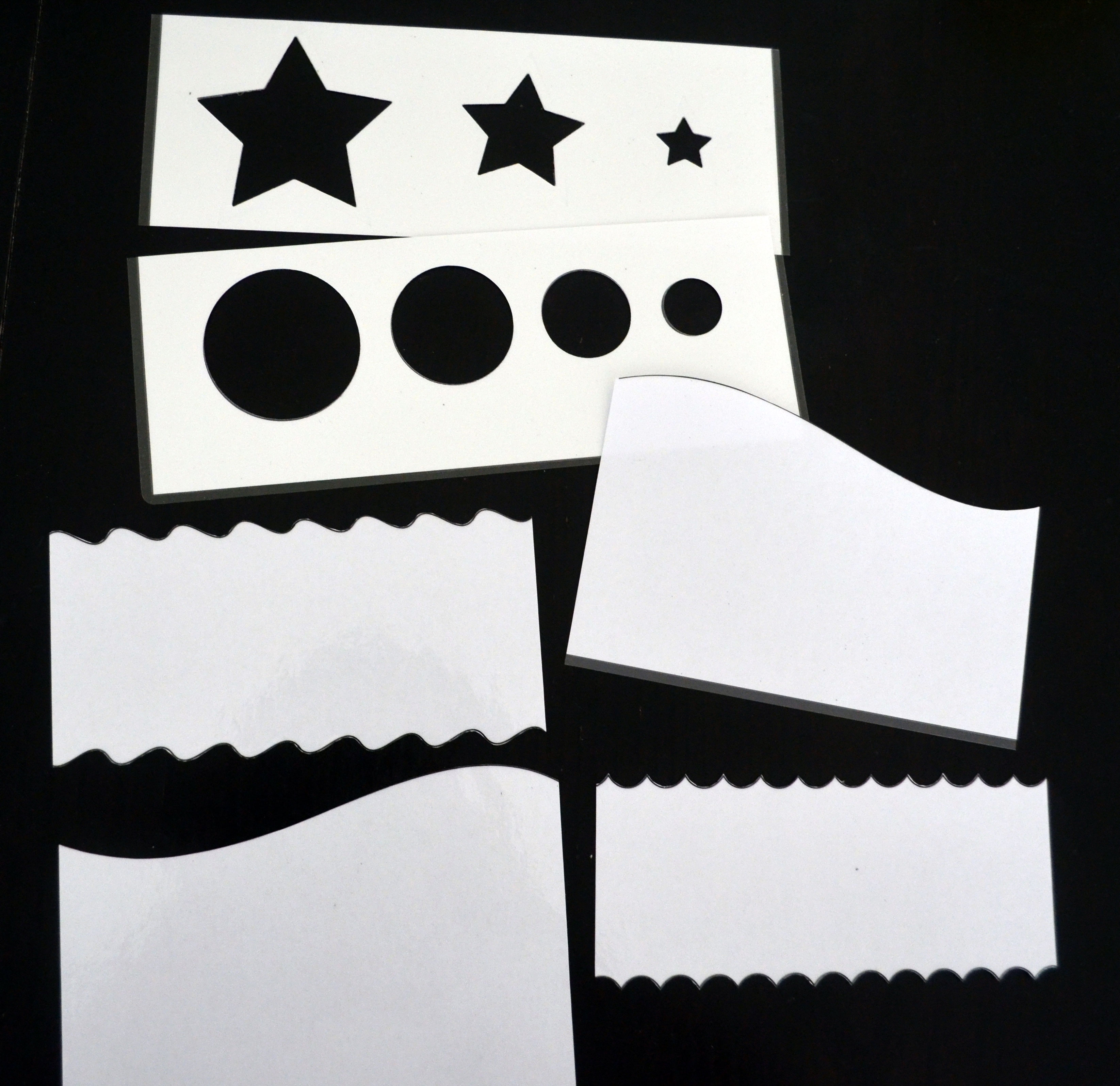 Diese Schablonen habe ich selbst hergestellt – Sterne und Kreise sind einfach ausgestanzt, die anderen habe ich am Computer gezeichnet, ausgedruckt, laminiert und ausgeschnitten.